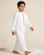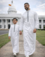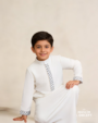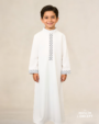 The refined black embroidery flowing along the front placket and cuffs is deliberate and restrained, creating contrast with meaning rather than excess. Each detail is thoughtfully placed, drawing a dialogue between light and shadow, tradition and modern expression. Defined by a clean silhouette and precise tailoring, the NOOR Classic Thobe stands as a symbol of composure, balance, and inner illumination.